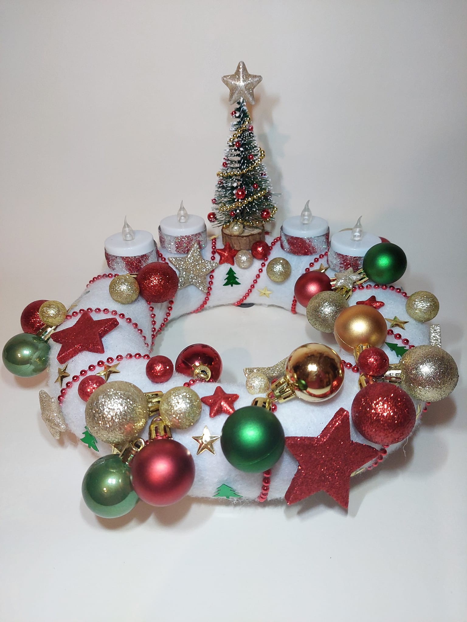 25 cm-es szalma alapra készült adventi koszorú, ledes mécsesekkel, melyek akár cserélhetőek is. A modern és a régi stílus ötvözete.